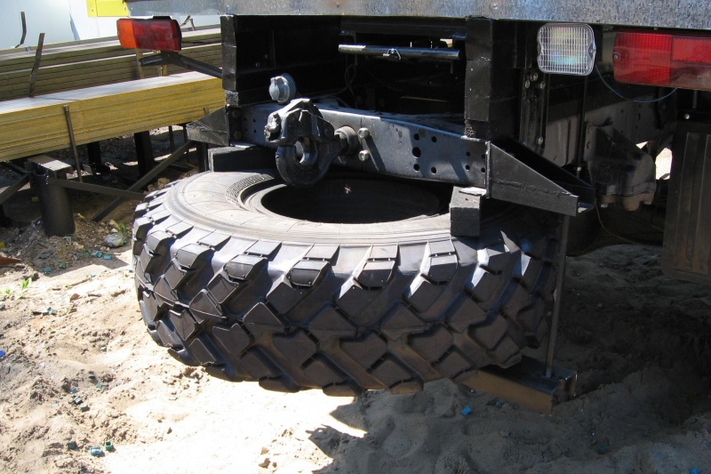 Дело в том, что, во-первых, крепление монтируется под задней стенкой кузова. Это так называемый подрамный вариант. Зона под рамой функционально не задействована и идеально подходит для установки ДЗК. Во-вторых, в конструкцию встраивается специальный механизм, облегчающий погрузку и выгрузку запасного колеса. При всем этом Вы можете не волноваться за сохранность «запаски»: колесо надежно фиксируется в держателе.