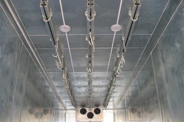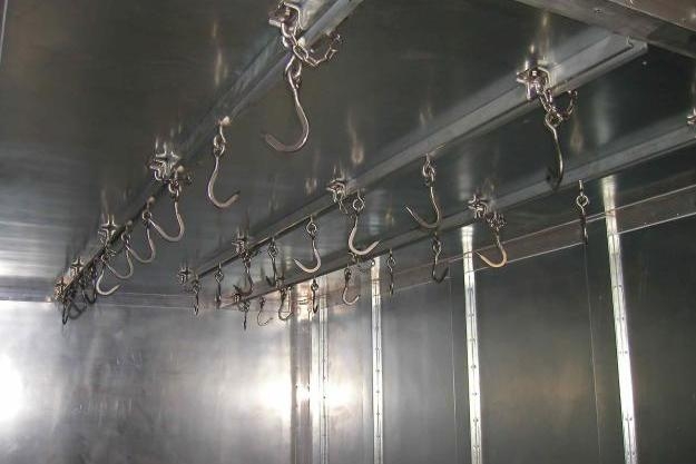 Крюки необходимы для того, чтобы мясные туши можно было перевозить в подвешенном положении. Основой для закрепления крюков являются профильные направляющие. Важно, чтобы они были изготовлены из нержавеющего металла. Пол кузова покрывается алюминием, причем швы провариваются достаточно герметично, чтобы выдержать сильный напор горячей воды, которой необходимо регулярно мыть внутреннее пространство кузова.